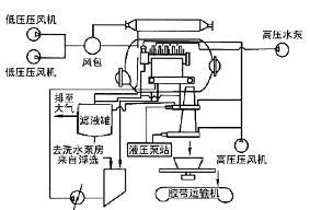 除了主機(jī)以外,尚有液壓系統(tǒng)、高壓風(fēng)機(jī)、低壓風(fēng)機(jī)、給料泵、各種風(fēng)動、電動閘門及給料機(jī)和運(yùn)輸機(jī)等輔助設(shè)備,參見圖2