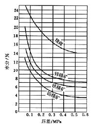 要現(xiàn)在過濾機(jī)工作的情況下改善過濾效果,更有效的方法就是提高過濾壓差,壓差對不同物料濾餅水分的影響如圖3所示。但要把真空狀態(tài)下使用的盤式過濾機(jī)改為正壓狀態(tài)下過濾,并應(yīng)用到工業(yè)生產(chǎn)中卻難度很大,主要體現(xiàn)在兩個方面:其一是由于過濾壓差增大,過濾速度加快,對于過濾機(jī)的結(jié)構(gòu)和性能提出一些要求;其二是在壓力密封條件下,要將濾餅順利排出且阻止壓氣逸出,也對加壓過濾技術(shù)提出更高的要求。